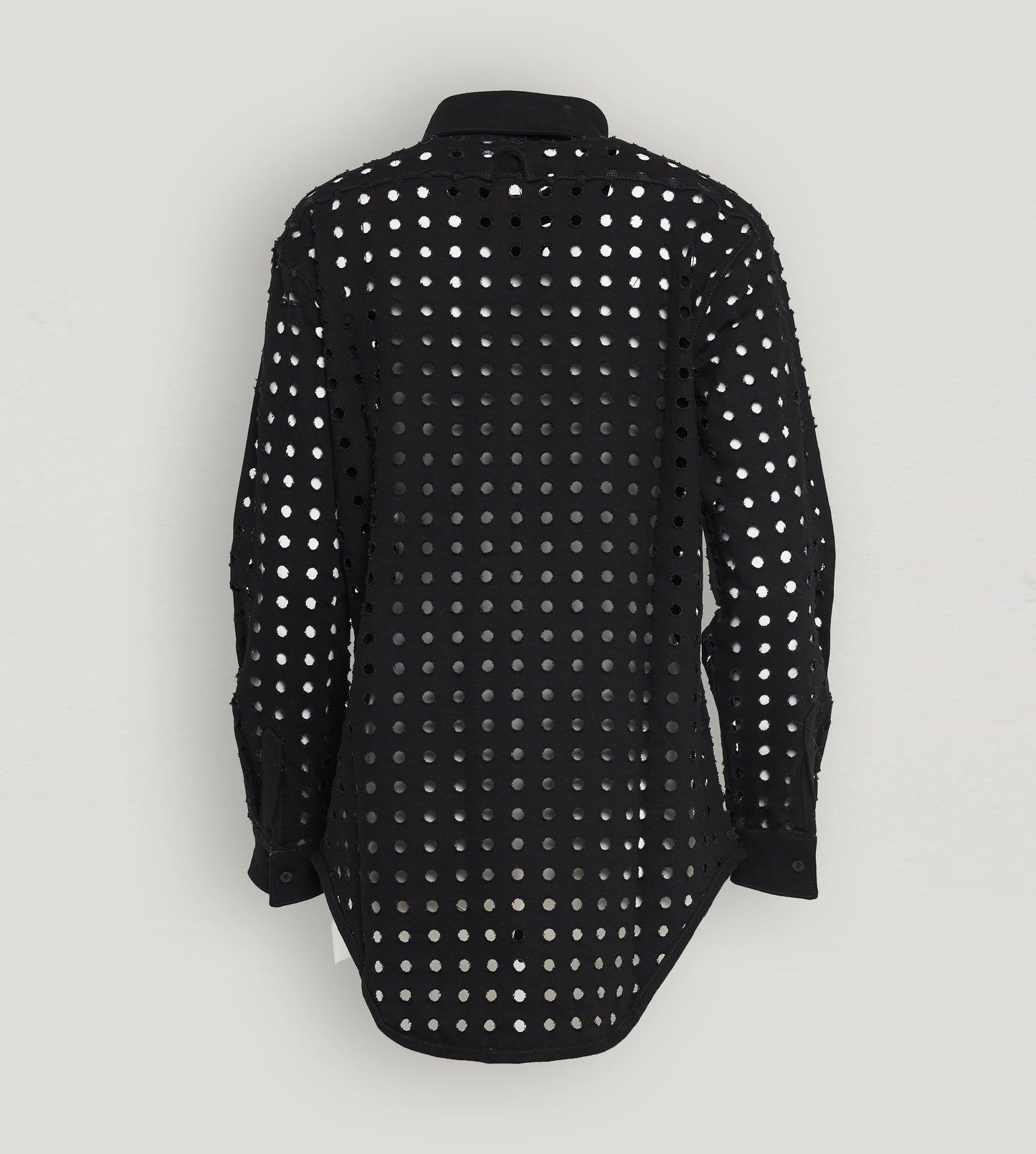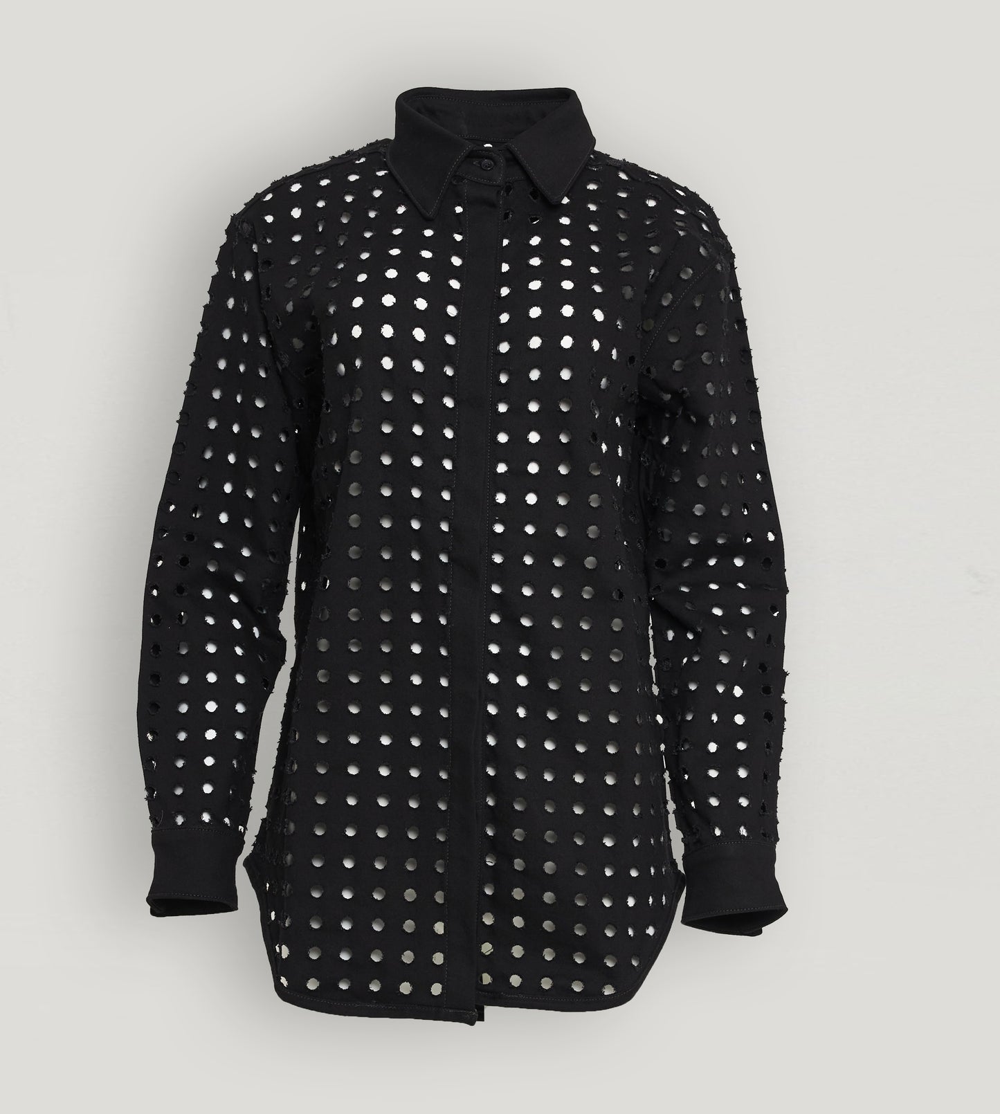 This fashion statement can revive any outfit. Like most of our pieces, this laser-cut oversized shirt can be worn from morning to night, adding to their versatility and uniqueness.